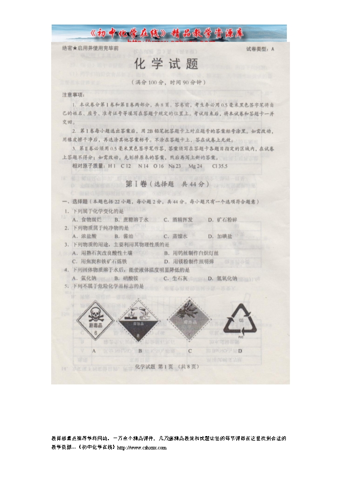 2014年山东省日照市中考化学试题及答案(扫描版)