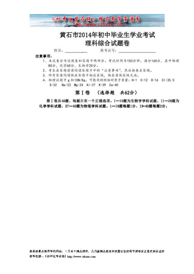 2014年湖北省黄石市中考化学试题及答案(扫描版)