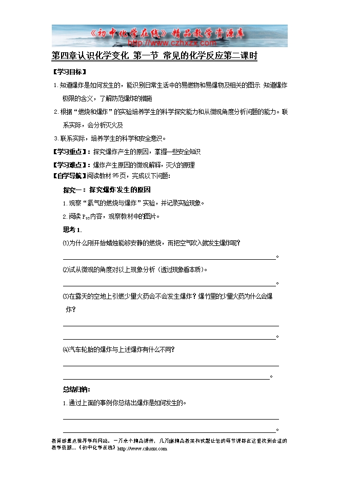 辽宁省东北育才中学2015届沪教版初中化学导学案《4.1常见的化学反应》(有答案)第二课时