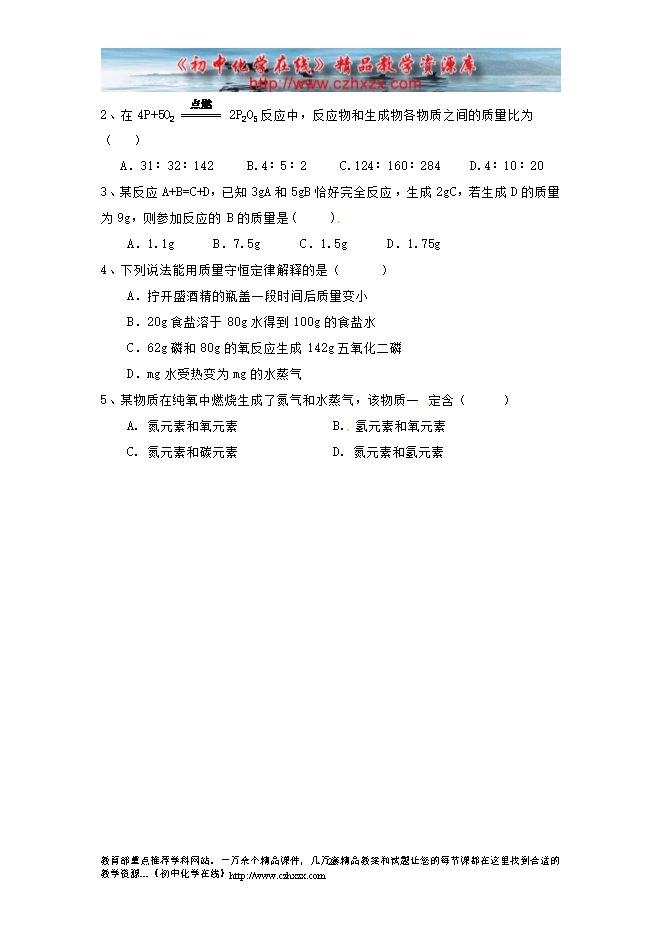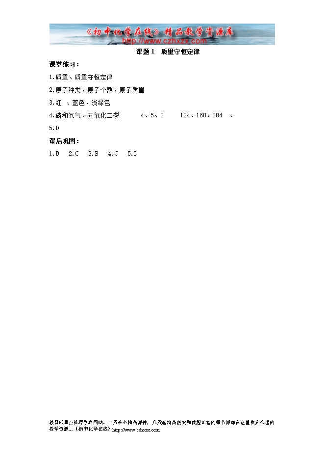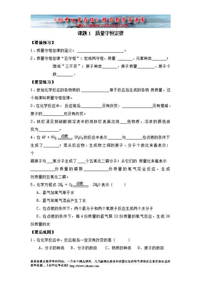 2014-2015人教版初中化学《第五单元课题1 质量守恒定律》一课三练(课前预习+课堂练习+课后巩固,含答案)