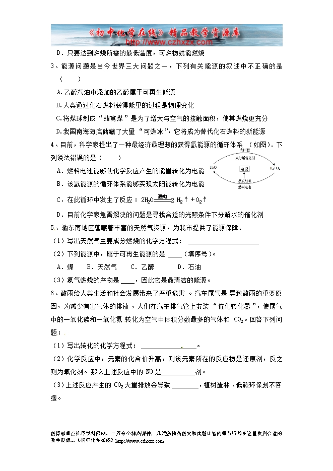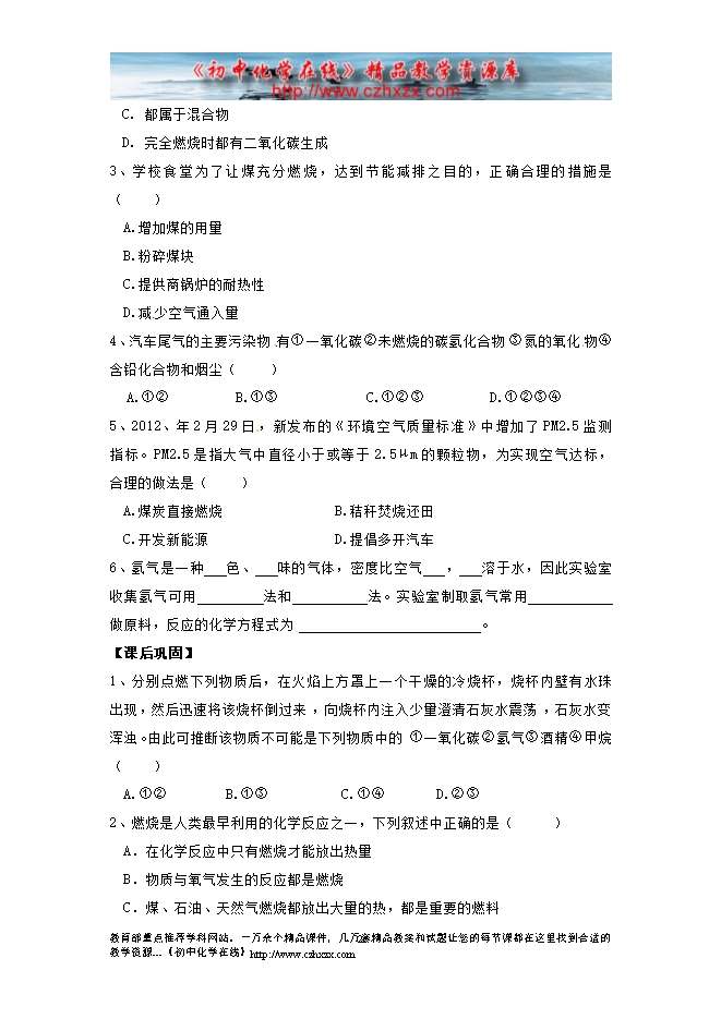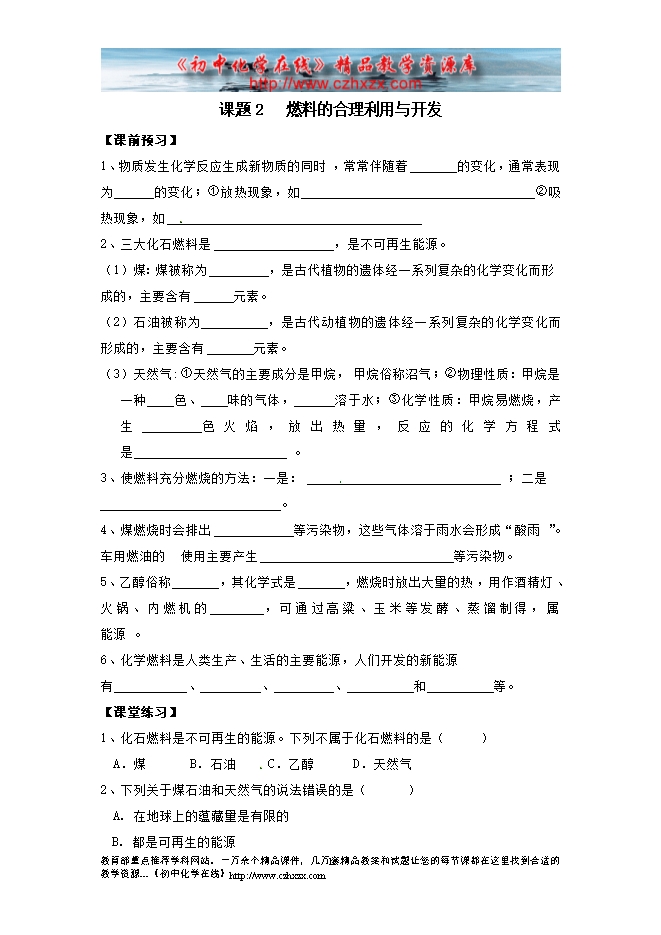 2014-2015人教版初中化学《第七单元课题2 燃料的合理利用与开发》一课三练(课前预习+课堂练习+课后巩固,含答案)