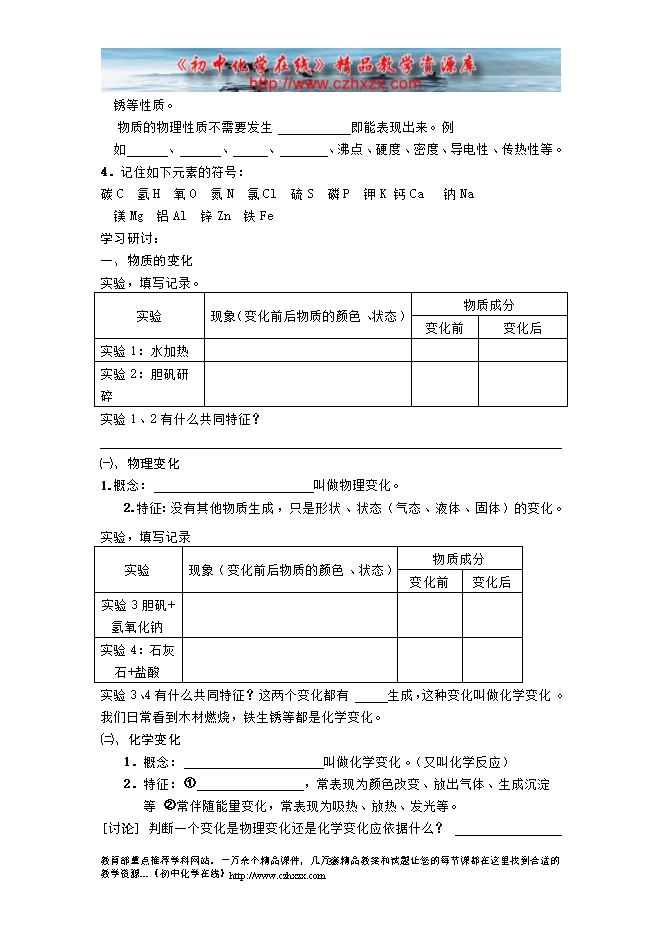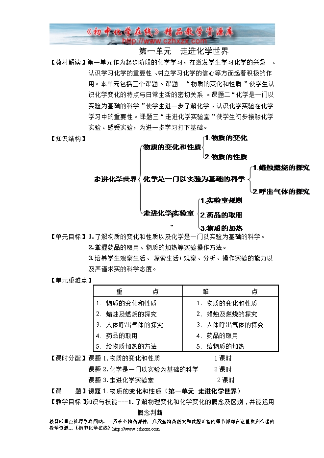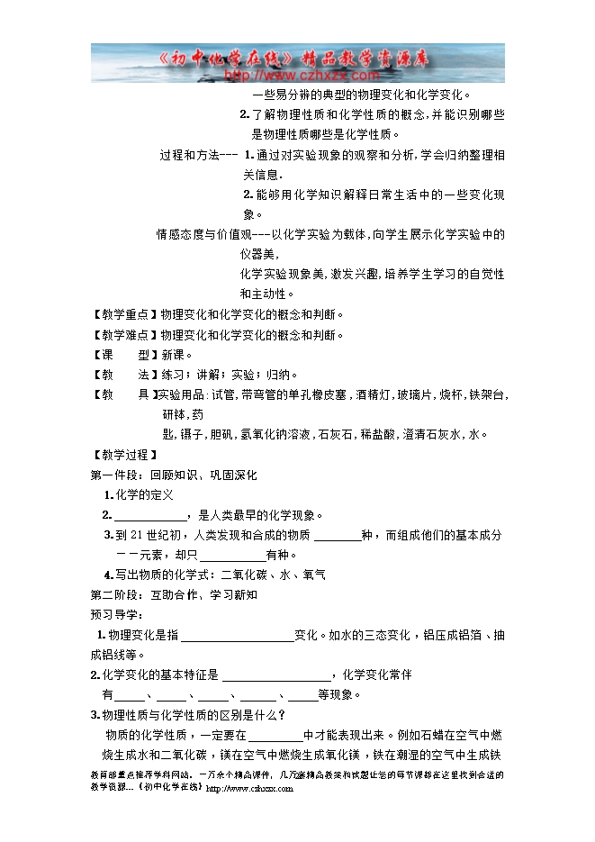 2014-2015人教版初中化学《第一单元课题1.物质的变化和性质》教学设计
