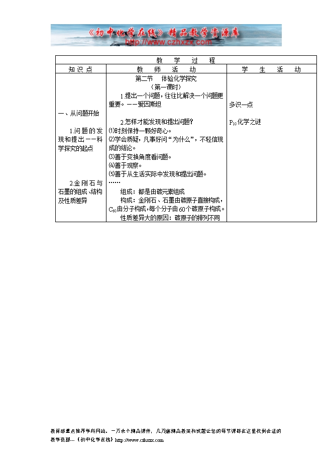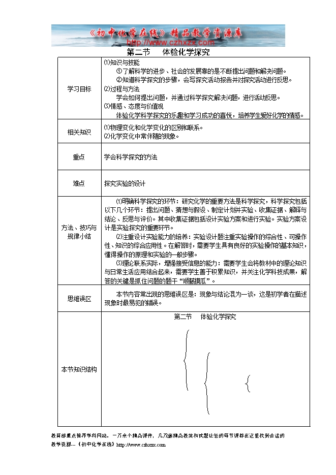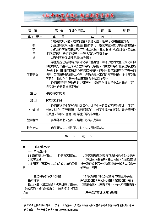 2014-2015新鲁教版初中化学《第一单元第二节 体验化学探究》教学设计
