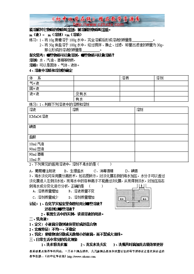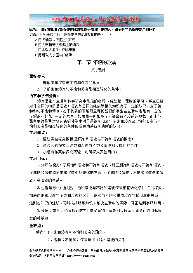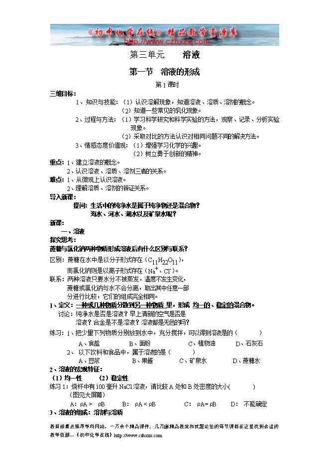 2014-2015新鲁教版初中化学《第三单元第一节 溶液的形成》教学设计
