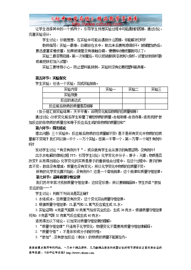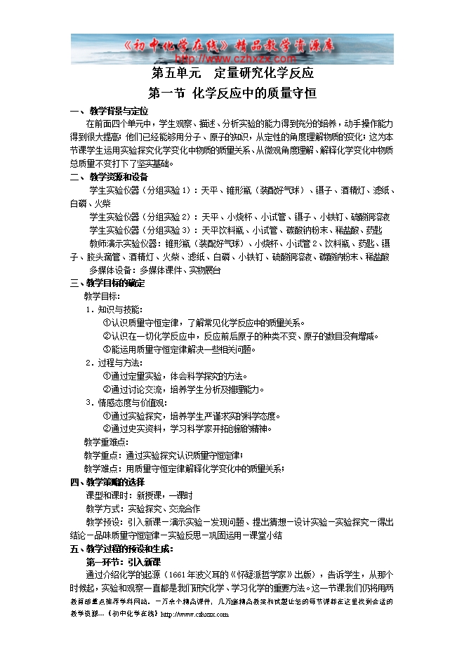 2014-2015新鲁教版初中化学《第五单元第一节 化学反应中的质量守恒》教学设计