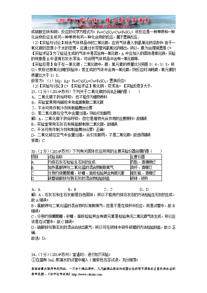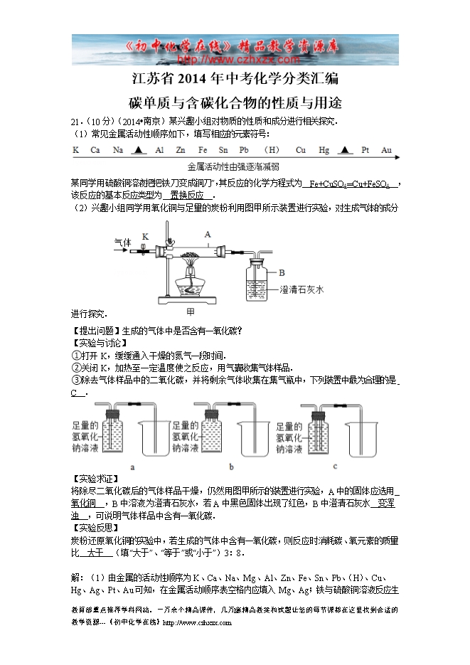 2014年江苏省中考化学分类汇编:6碳单质与含碳化合物的性质与用途