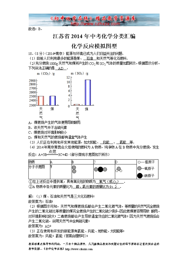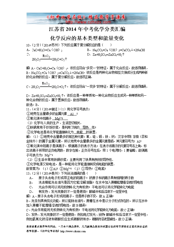 2014年江苏省中考化学分类汇编:7化学反应的基本类型和能量变化