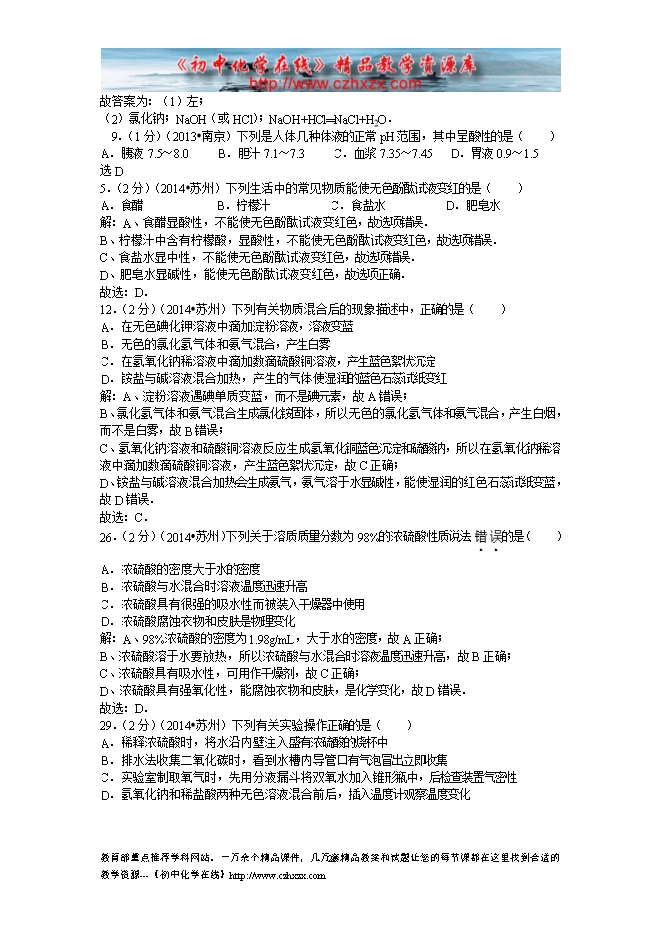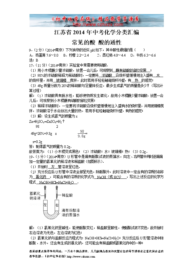 2014年江苏省中考化学分类汇编:10常见的酸 酸的通性