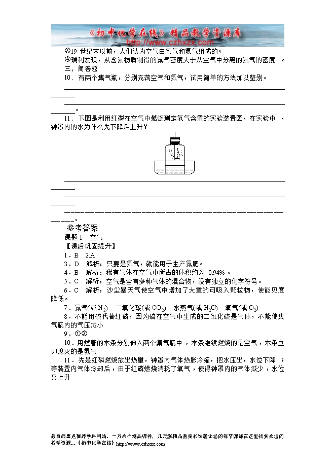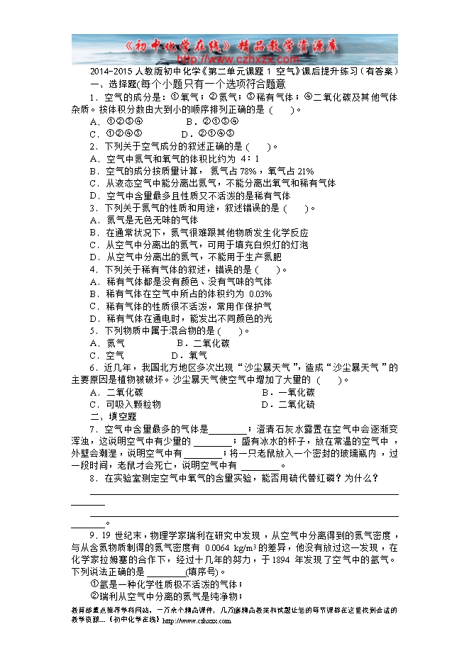 2014-2015人教版初中化学《第二单元课题1 空气》课后提升练习(有答案)