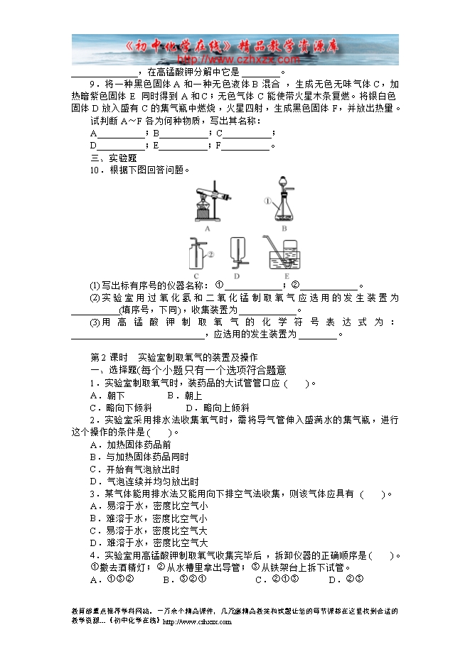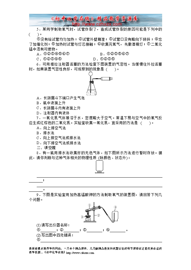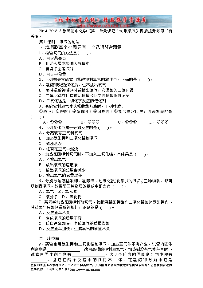 2014-2015人教版初中化学《第二单元课题3 制取氧气》课后提升练习(有答案)