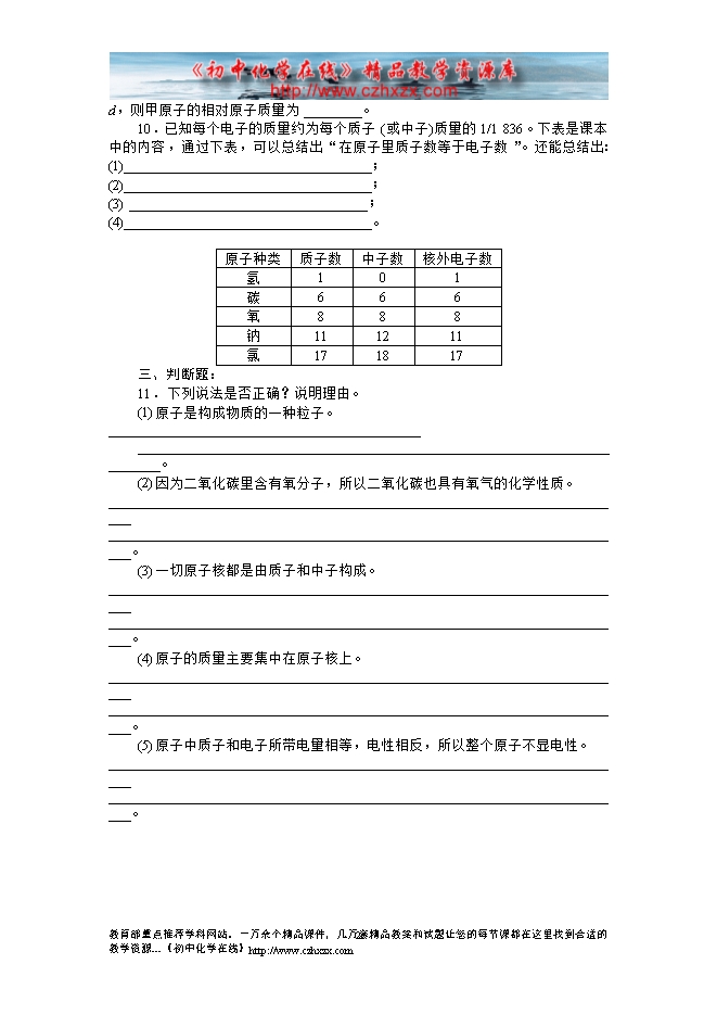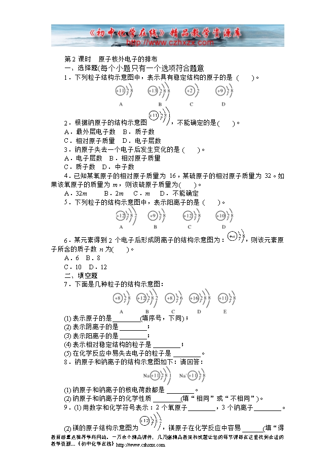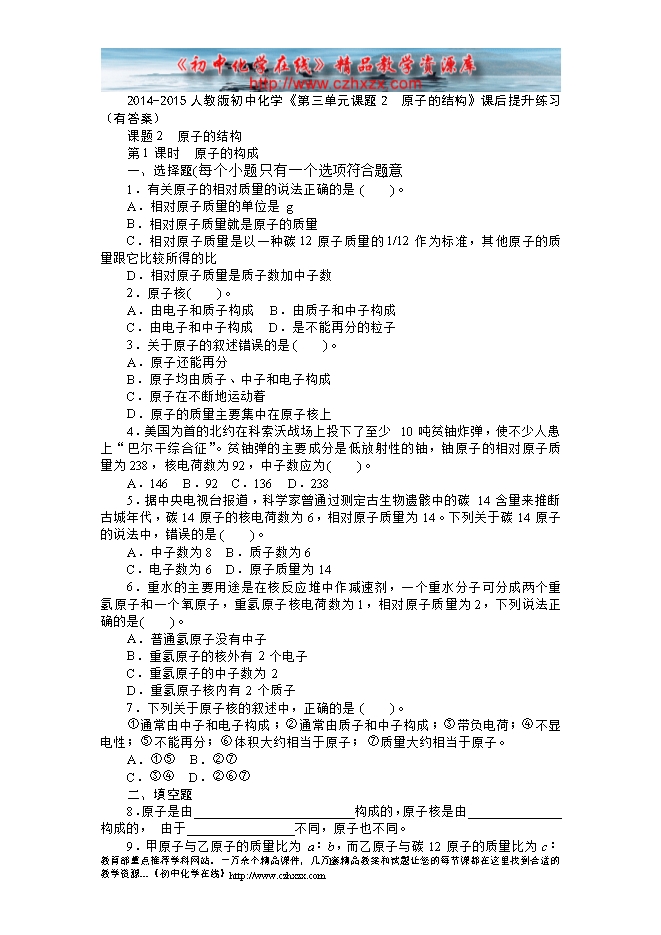 2014-2015人教版初中化学《第三单元课题2 原子的结构》课后提升练习(有答案)