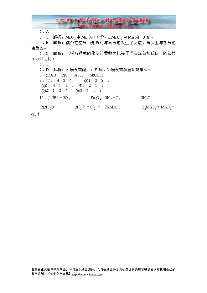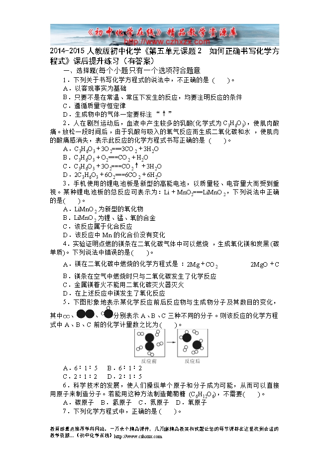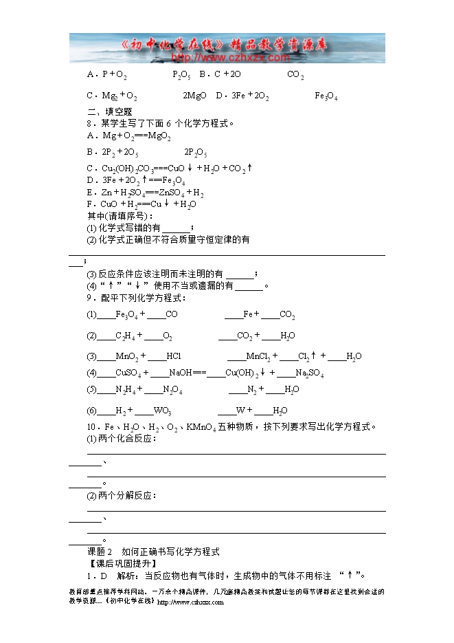 2014-2015人教版初中化学《第五单元课题2 如何正确书写化学方程式》课后提升练习(有答案)