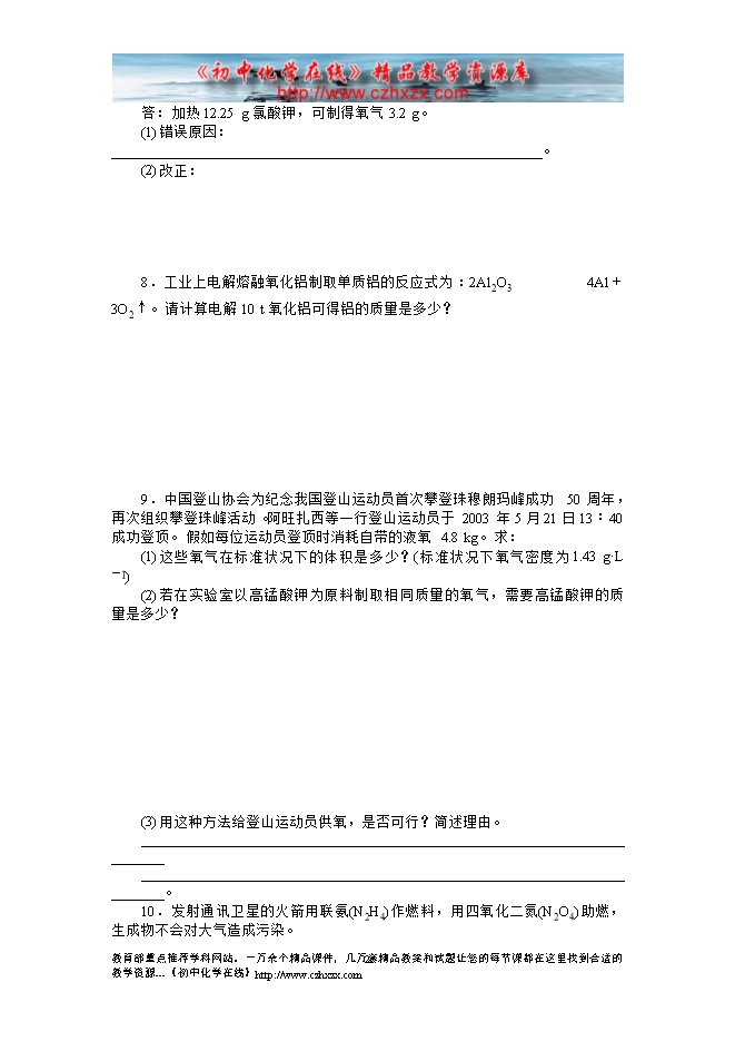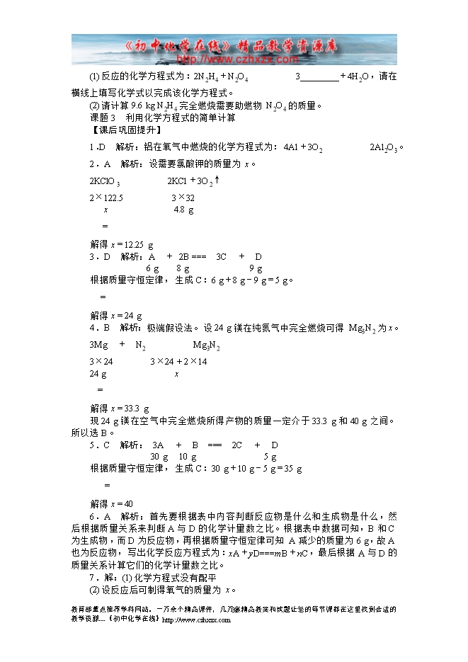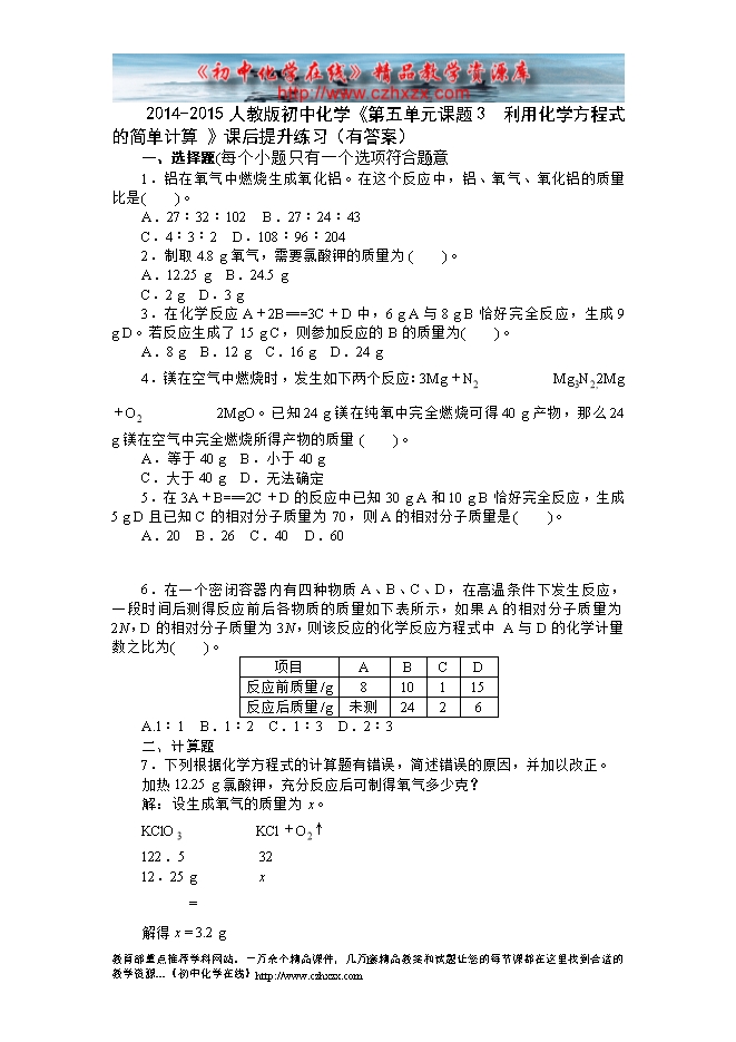 2014-2015人教版初中化学《第五单元课题3 利用化学方程式的简单计算 》课后提升练习(有答案)