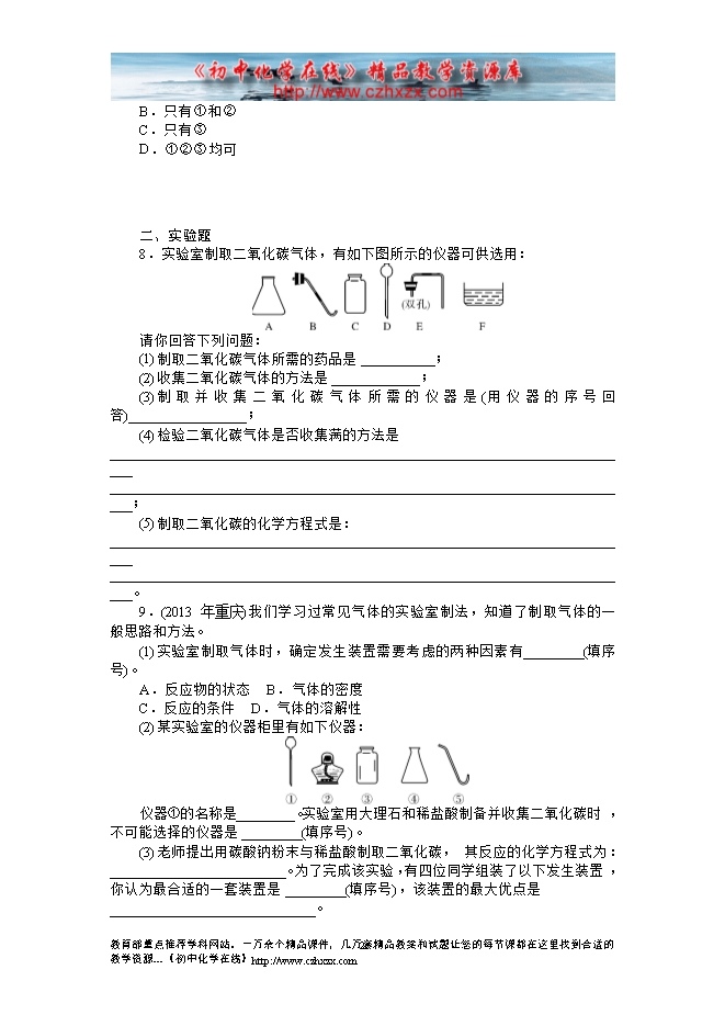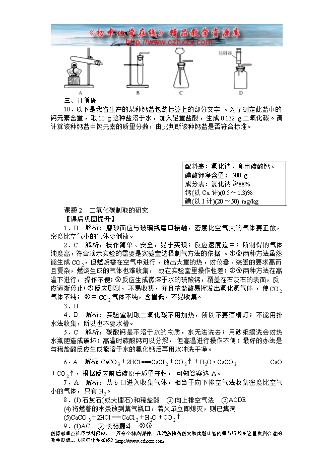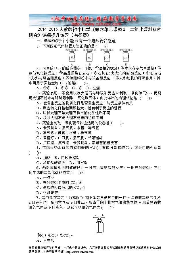 2014-2015人教版初中化学《第六单元课题2 二氧化碳制取的研究》课后提升练习(有答案)