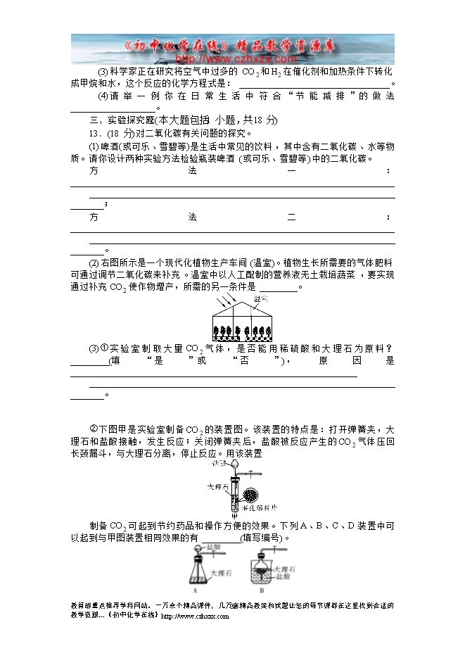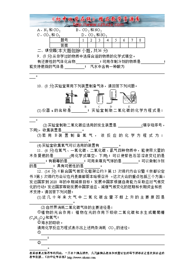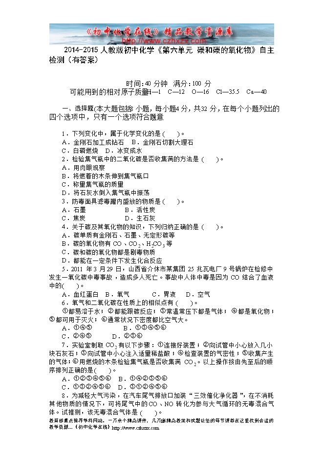 2014-2015人教版初中化学《第六单元 碳和碳的氧化物》自主检测(有答案)