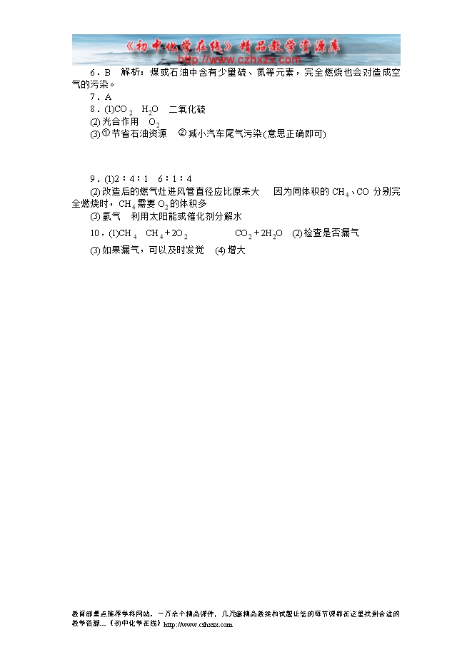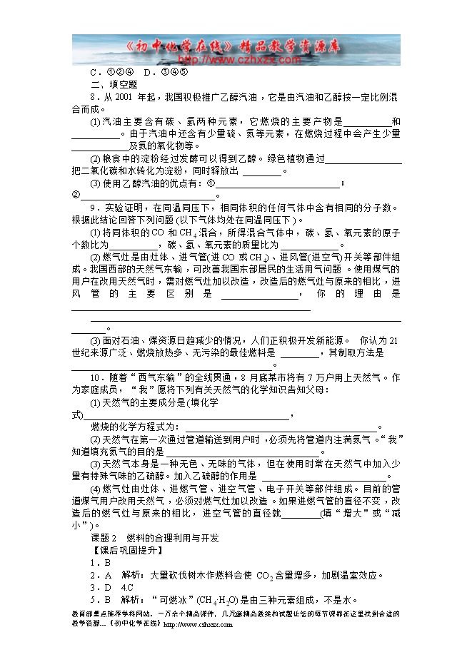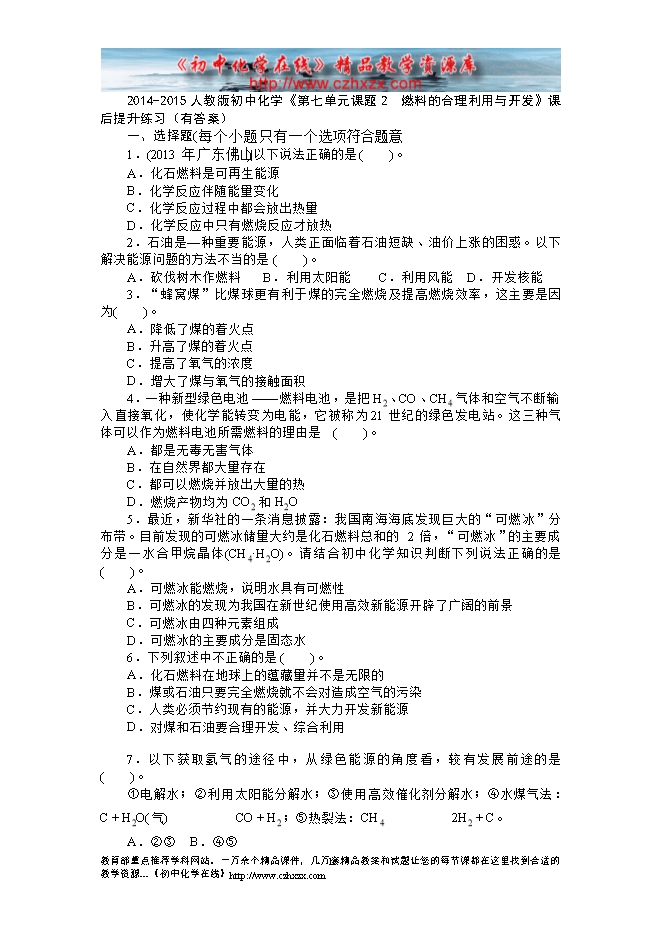 2014-2015人教版初中化学《第七单元课题2 燃料的合理利用与开发》课后提升练习(有答案)