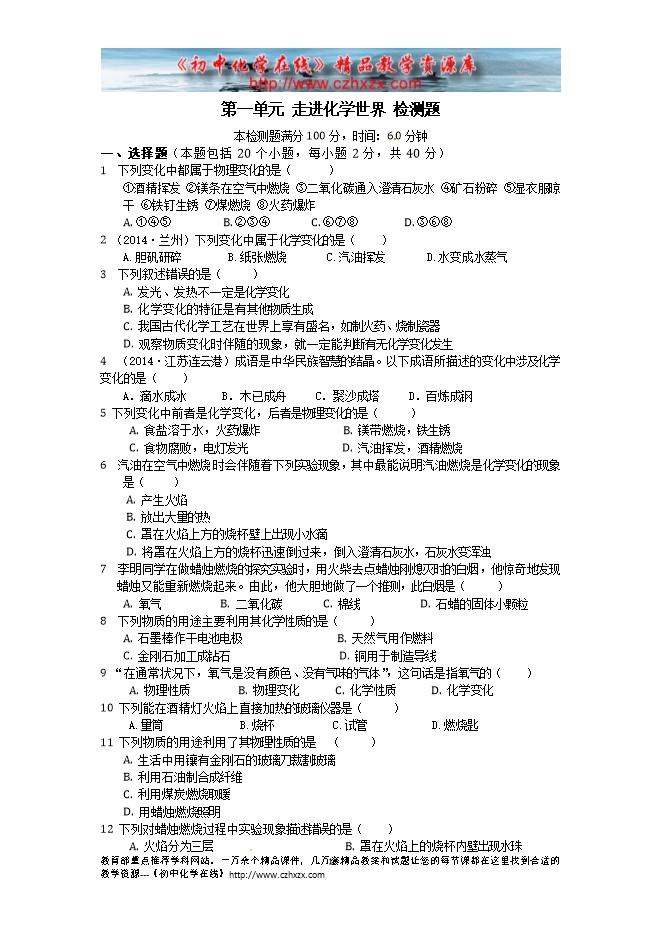 【中学教材全解】2015人教版初中化学第一单元《走进化学世界》检测题(有答案及解析)