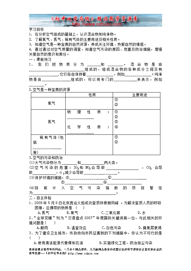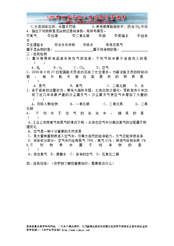 甘肃省玉门市花海中学人教版化学《第2单元课题1 空气第二课时》导学案(无答案)