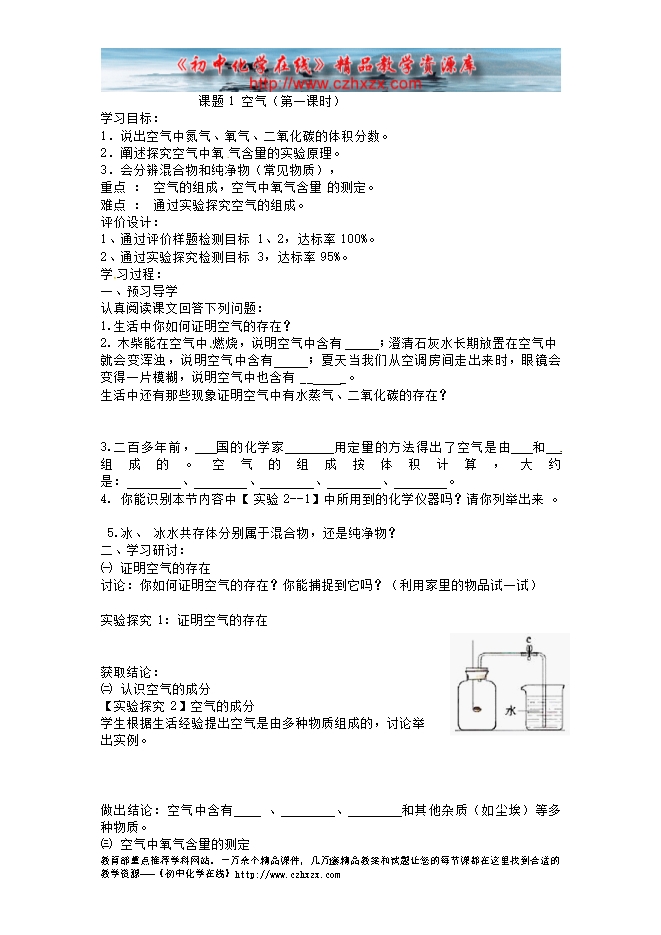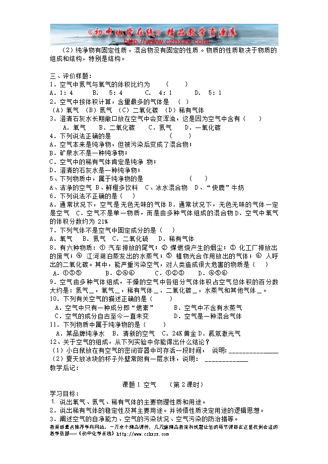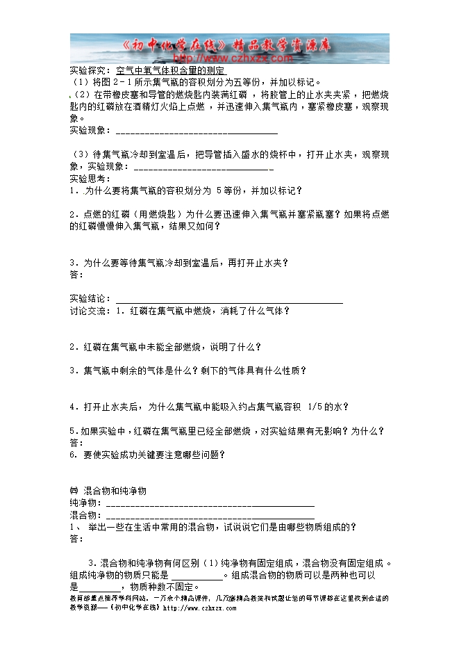 甘肃省玉门市花海中学人教版化学《第二单元 课题1空气(2课时)》导学案2(无答案)
