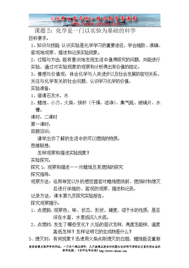 人教版《第一单元课题2 化学是一门以实验为基础的科学》教学设计(方案一)