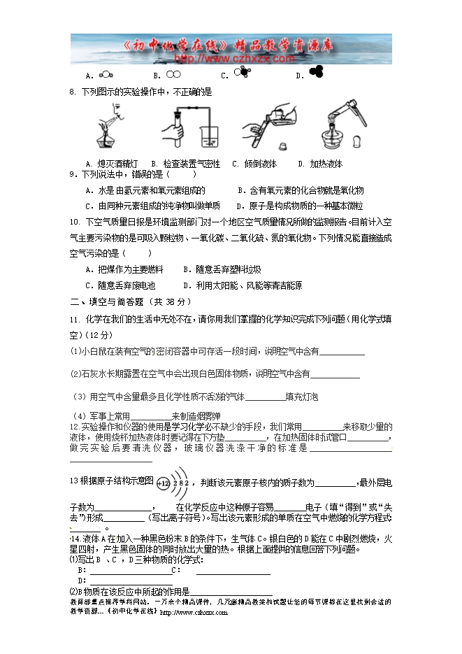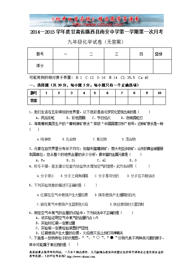 2014—2015学年度甘肃省陇西县南安中学第一学期第一次月考九年级化学试卷(无答案)