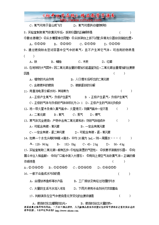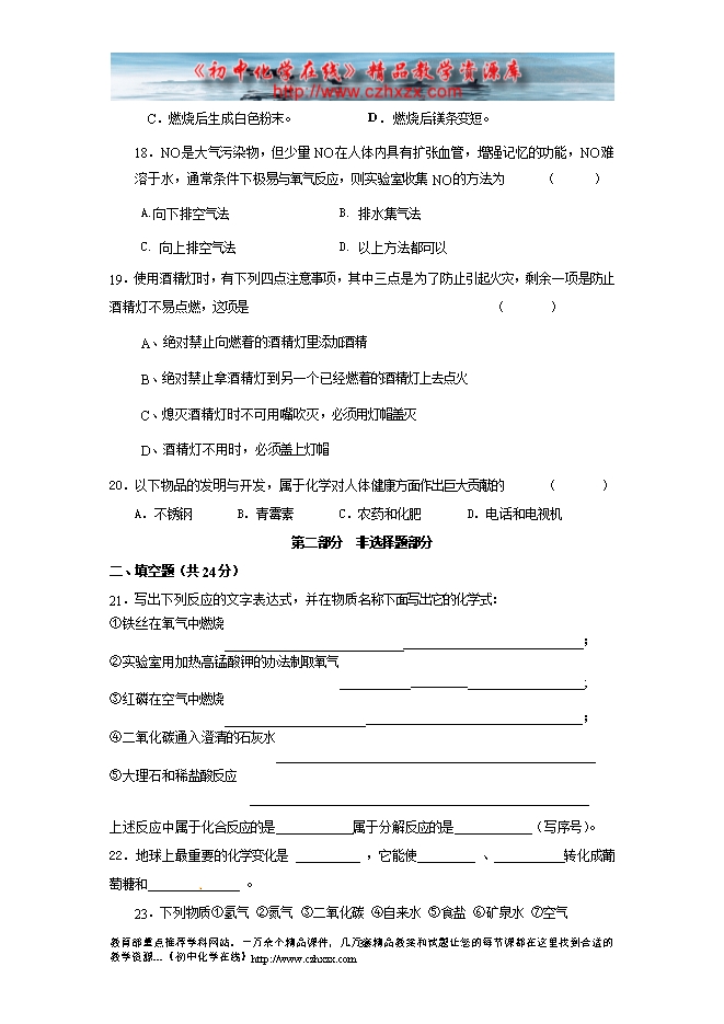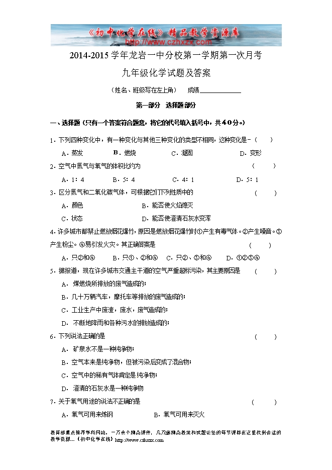 2014-2015学年福建省龙岩一中分校第一学期第一次月考九年级化学试题及答案