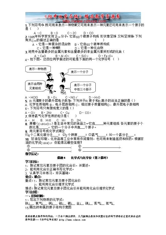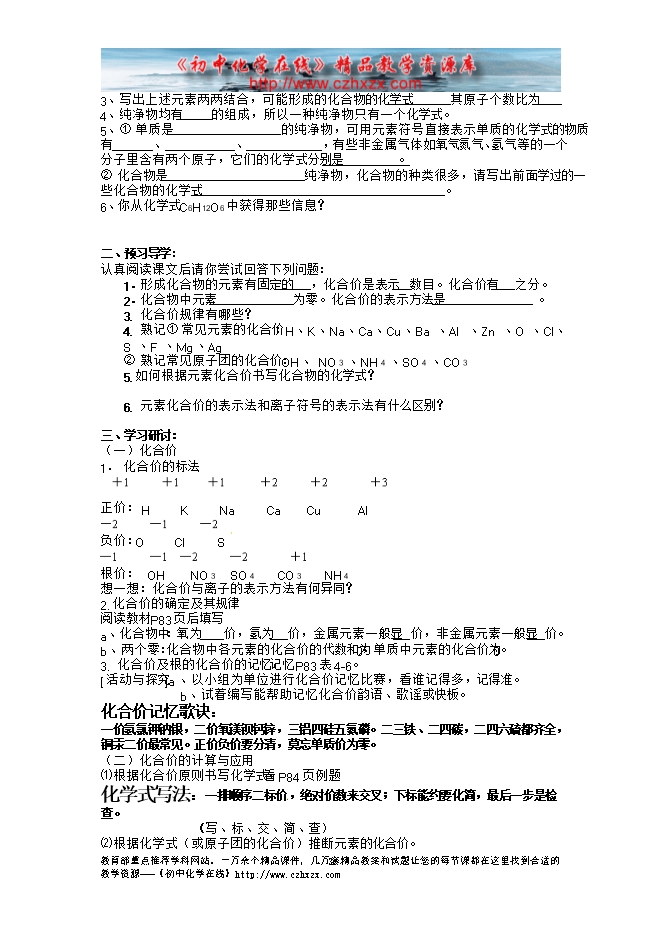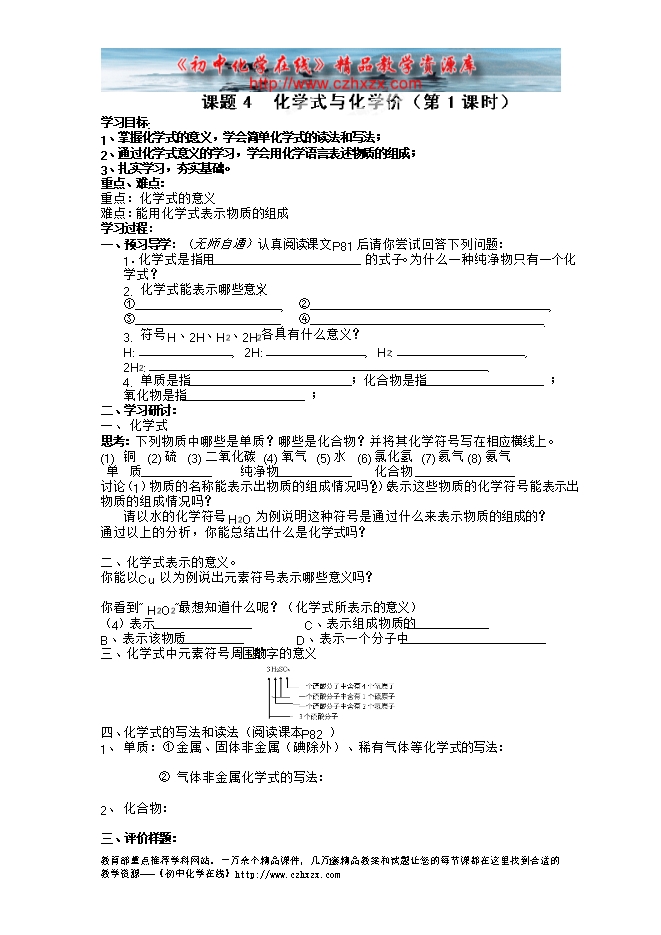 甘肃省玉门市花海中学人教版化学《第四单元课题4 化学式和化合价》导学案(无答案)