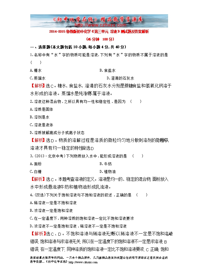 2014-2015鲁教版初中化学《第三单元 溶液》测试题及答案解析