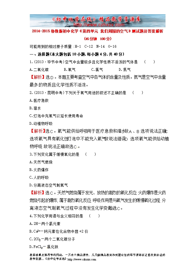 2014-2015鲁教版初中化学《第四单元 我们周围的空气》测试题及答案解析