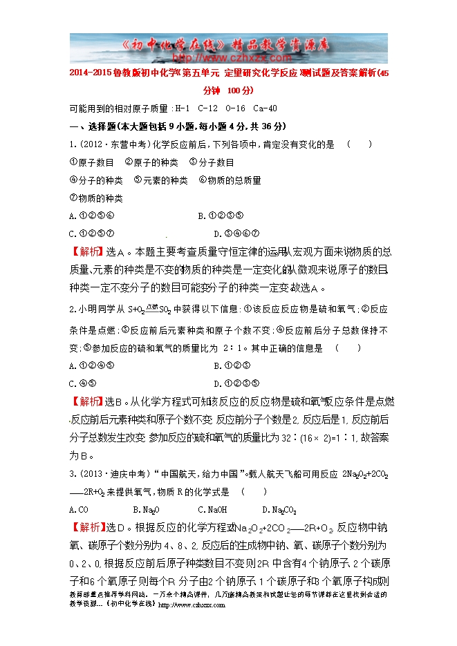 2014-2015鲁教版初中化学《第五单元 定量研究化学反应》测试题及答案解析