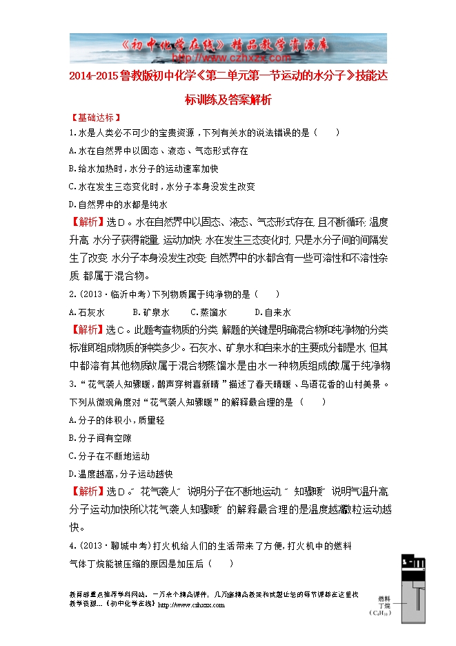 2014-2015鲁教版初中化学《第二单元第一节运动的水分子》技能达标训练及答案解析