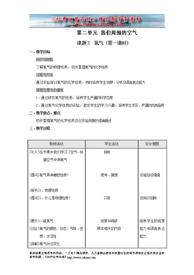 人教版《第二单元课题2 氧气 》教学设计(方案一)第一课时