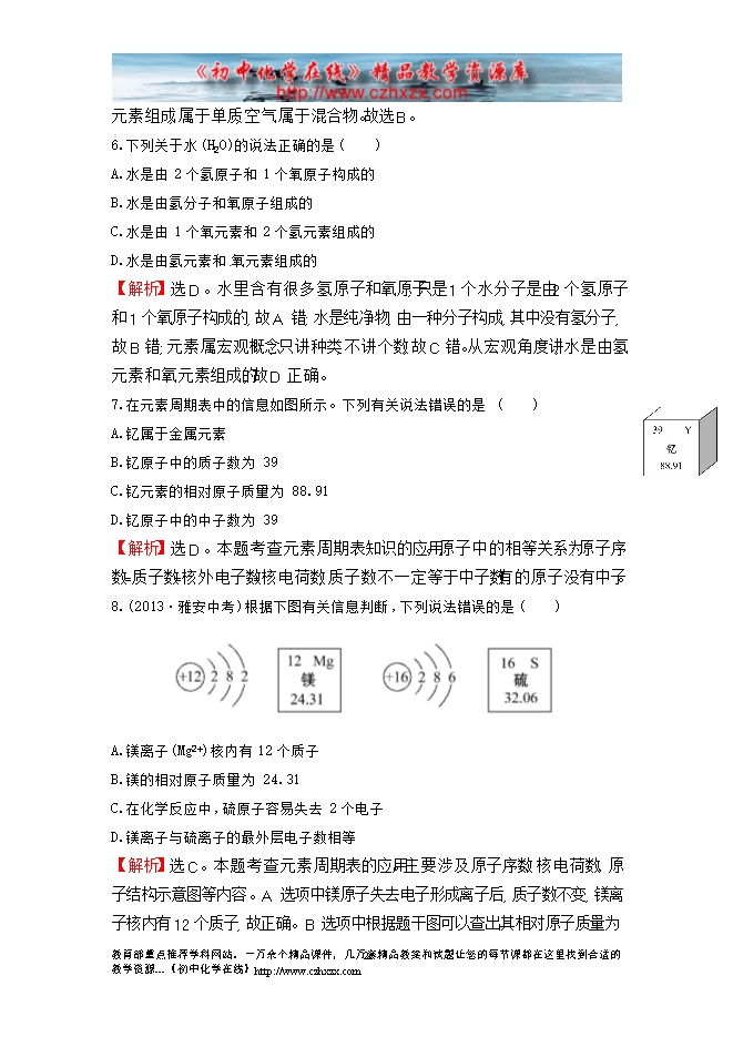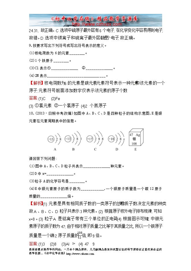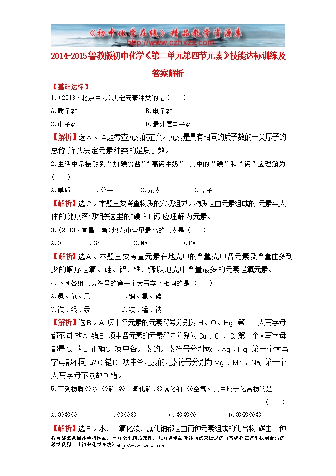 2014-2015鲁教版初中化学《第二单元第四节元素》技能达标训练及答案解析