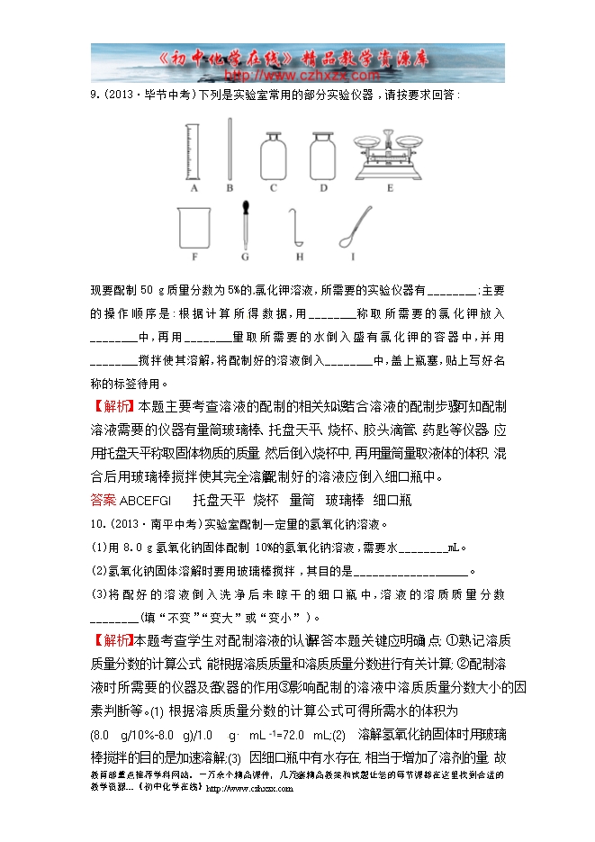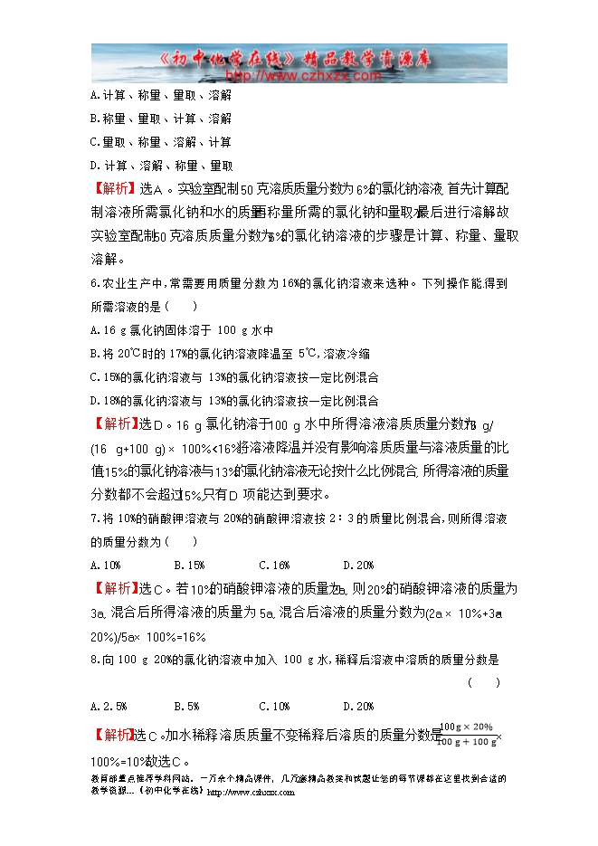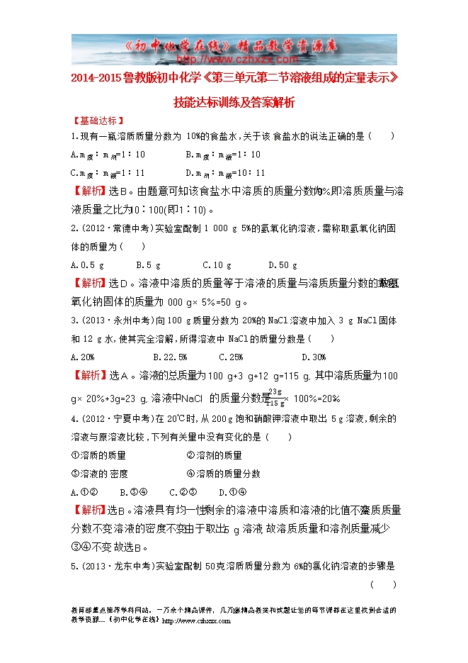 2014-2015鲁教版初中化学《第三单元第二节溶液组成的定量表示》技能达标训练及答案解析