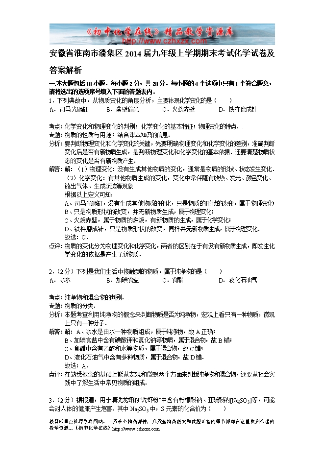 安徽省淮南市潘集区2014届九年级上学期期末考试化学试卷及答案解析