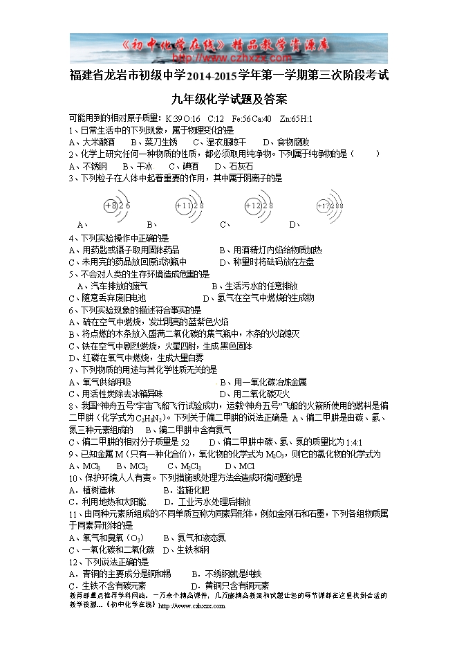 福建省龙岩市初级中学2014-2015学年第一学期第三次阶段考试九年级化学试题及答案