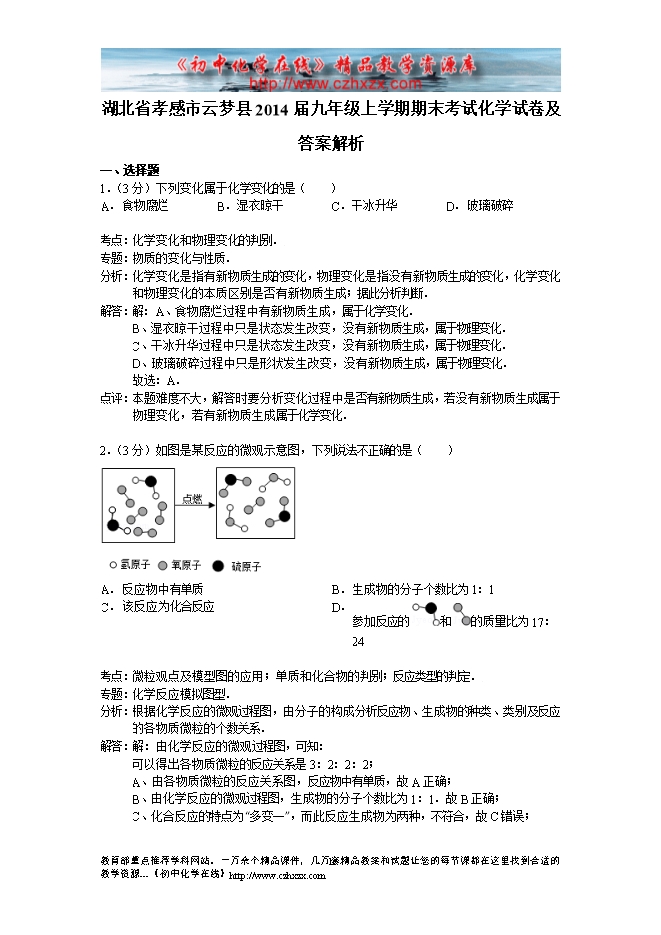 湖北省孝感市云梦县2014届九年级上学期期末考试化学试卷及答案解析