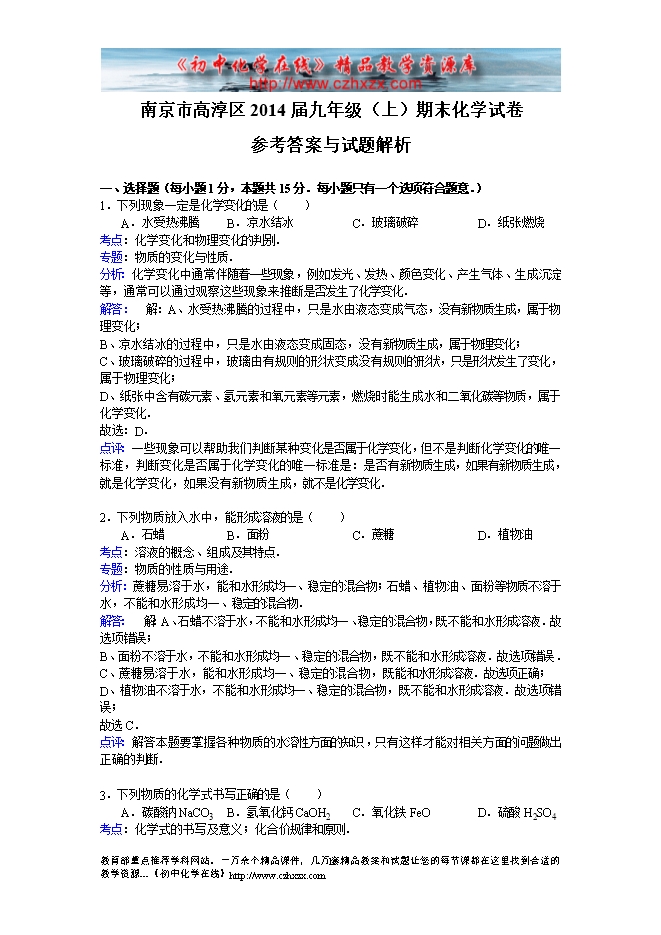 南京市高淳区2014届九年级(上)期末化学试卷参考答案与试题解析