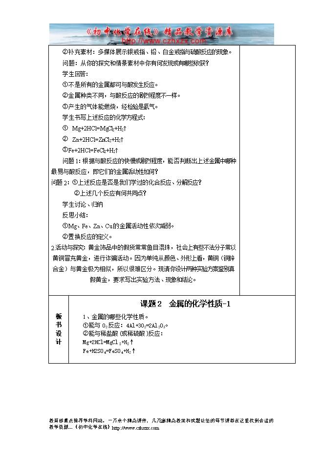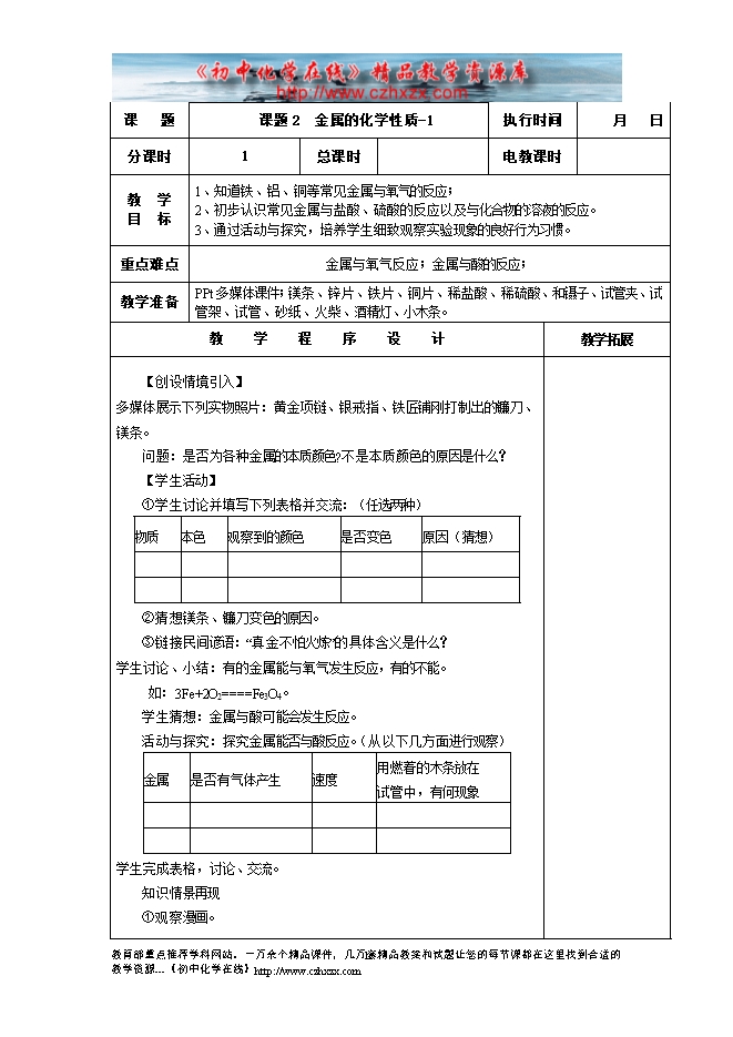 2014-2015新人教版化学九年级下册《第八单元课题2 金属的化学性质(第一课时)》教学设计