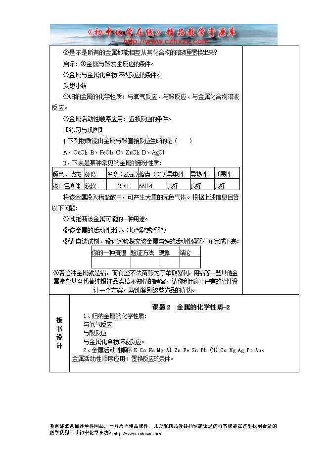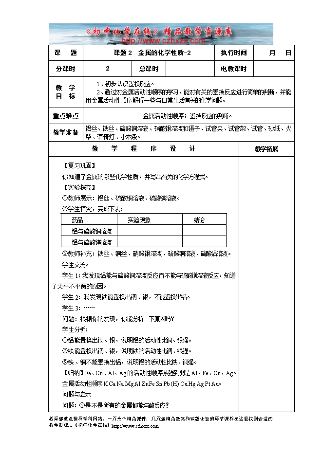 2014-2015新人教版化学九年级下册《第八单元课题2 金属的化学性质(第二课时)》教学设计