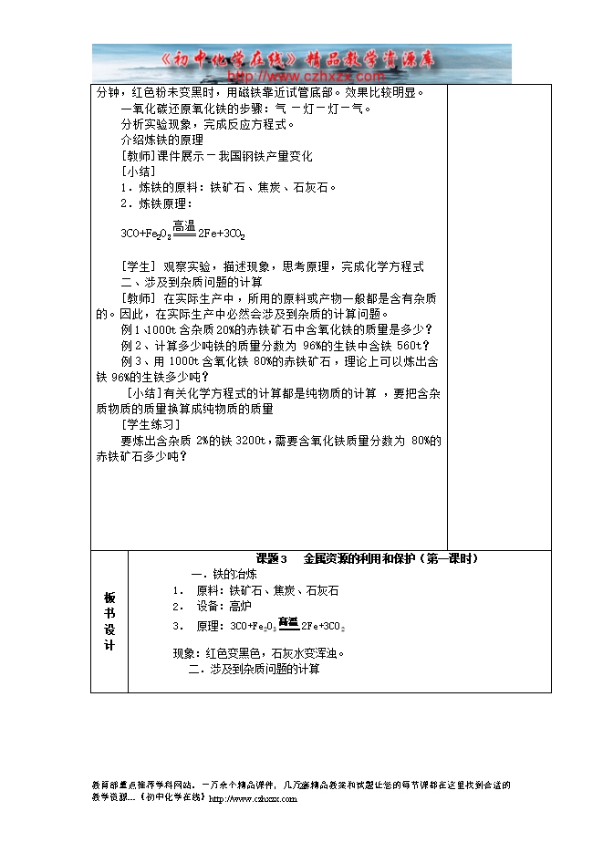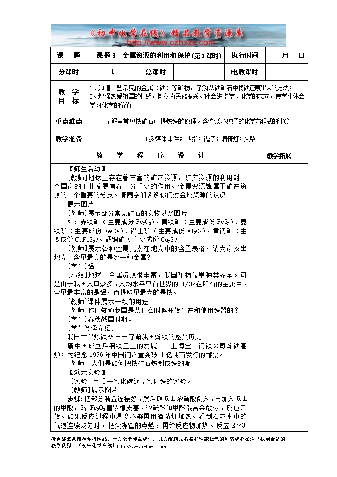 2014-2015新人教版化学九年级下册《第八单元课题3 金属资源的利用和保护(第一课时)》教学设计