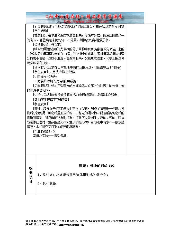 2014-2015新人教版化学九年级下册《第九单元课题1 溶液的形成(第二课时)》教学设计