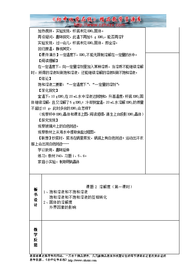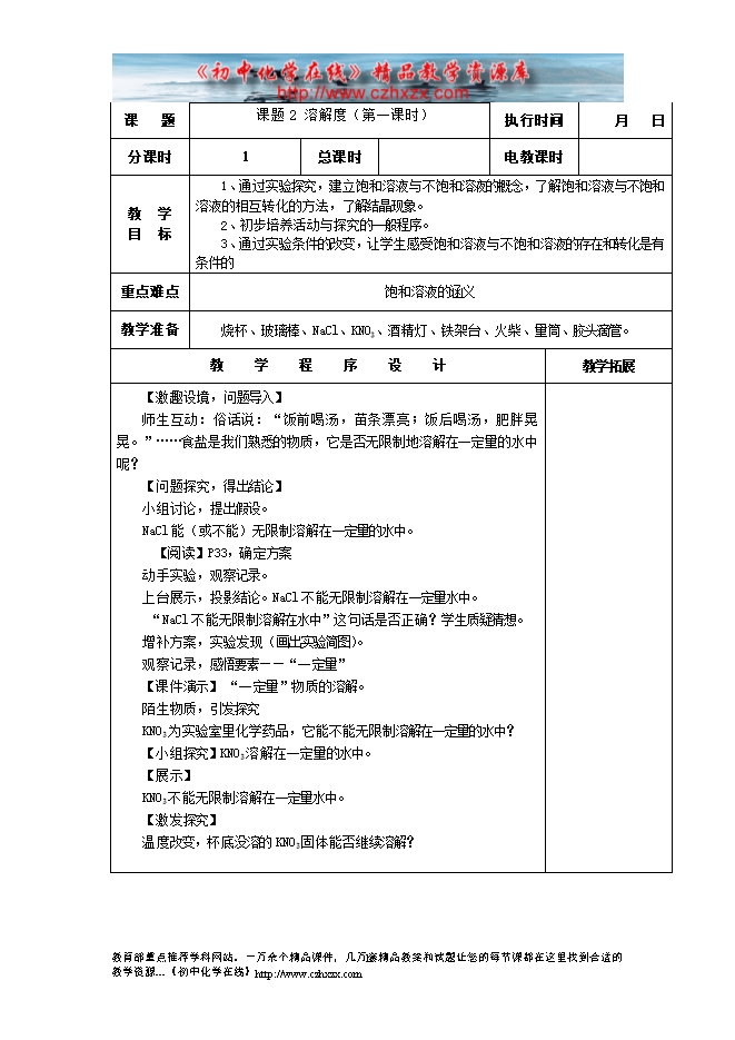 2014-2015新人教版化学九年级下册《第九单元 课题2 溶解度(第一课时)》教学设计