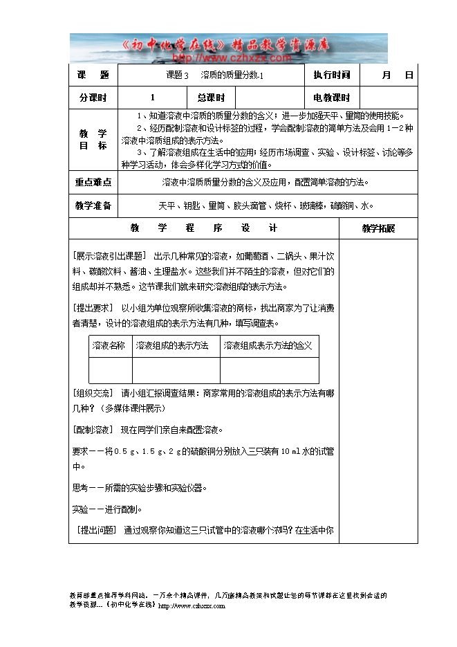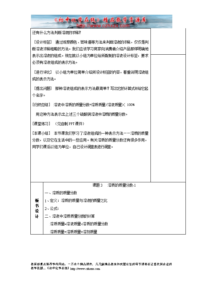 2014-2015新人教版化学九年级下册《第九单元课题3 溶液的浓度(第一课时)》教学设计