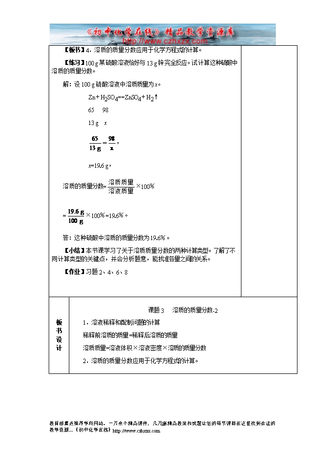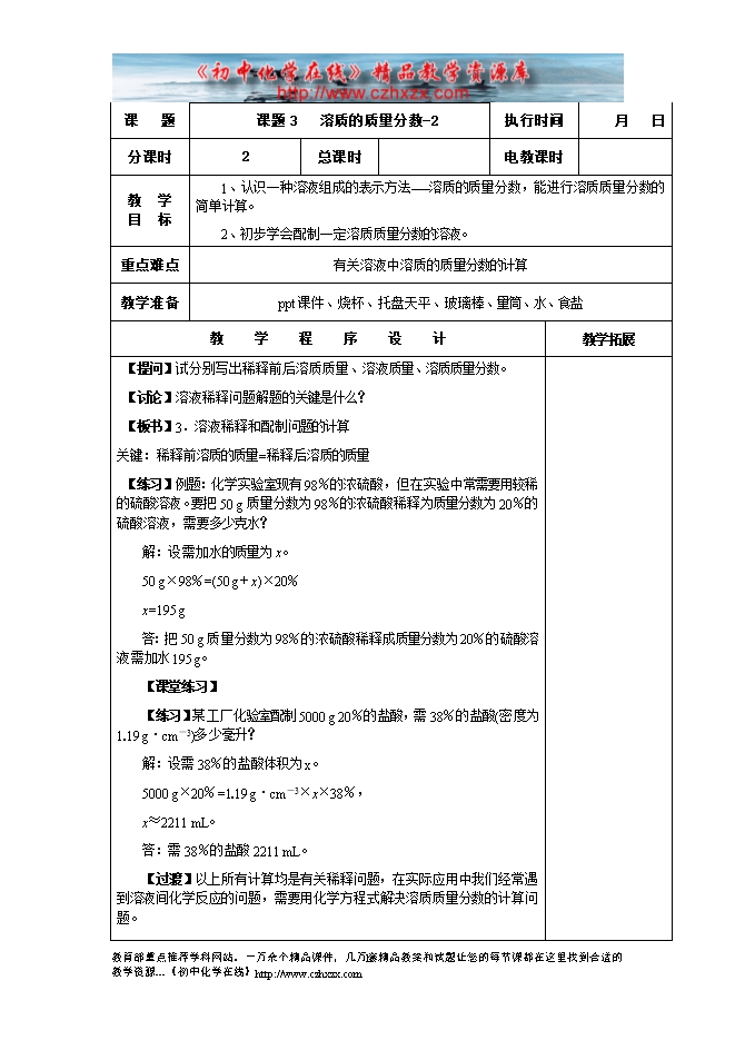2014-2015新人教版化学九年级下册《第九单元课题3 溶液的浓度(第二课时)》教学设计