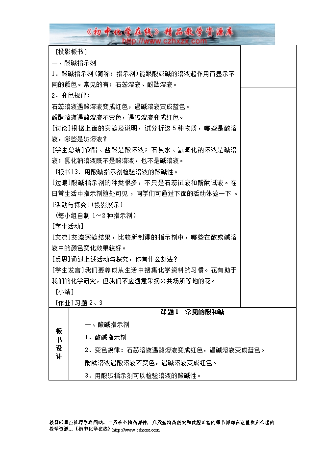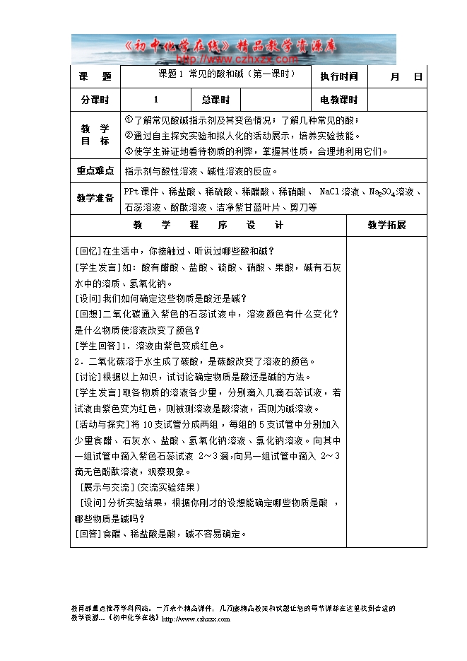 2014-2015新人教版化学九年级下册《第十单元课题1 常见的酸和碱(第一课时)》教学设计