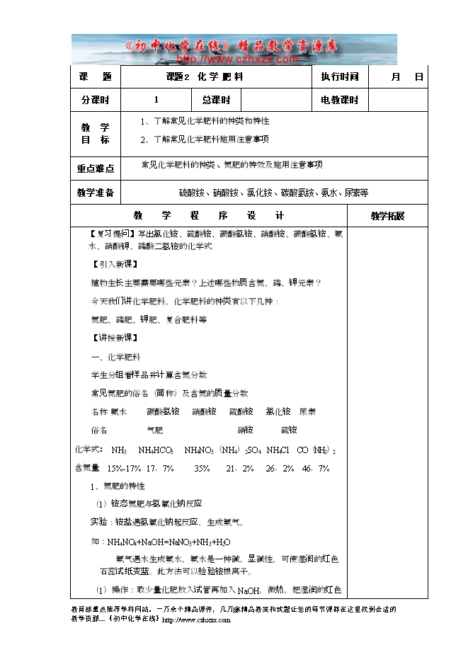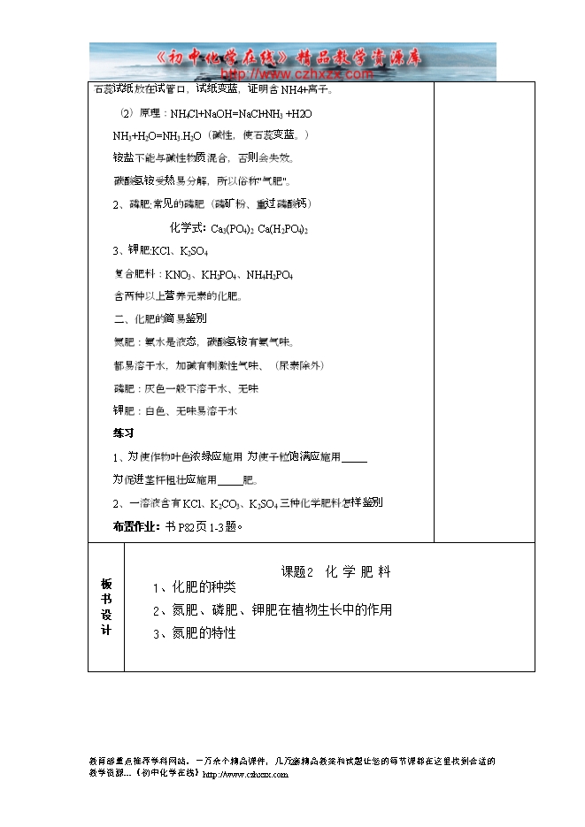 2014-2015新人教版化学九年级下册《第十一单元课题2 化学肥料》教学设计