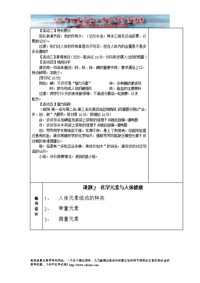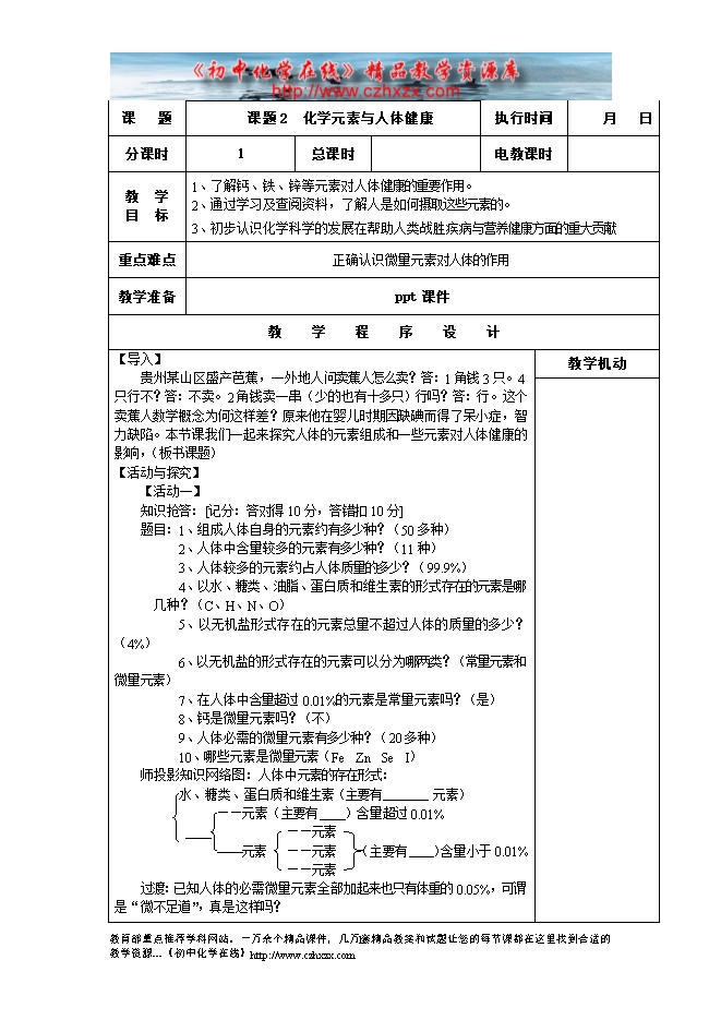 2014-2015新人教版化学九年级下册《第十二单元课题2 化学元素与人体健康》教学设计