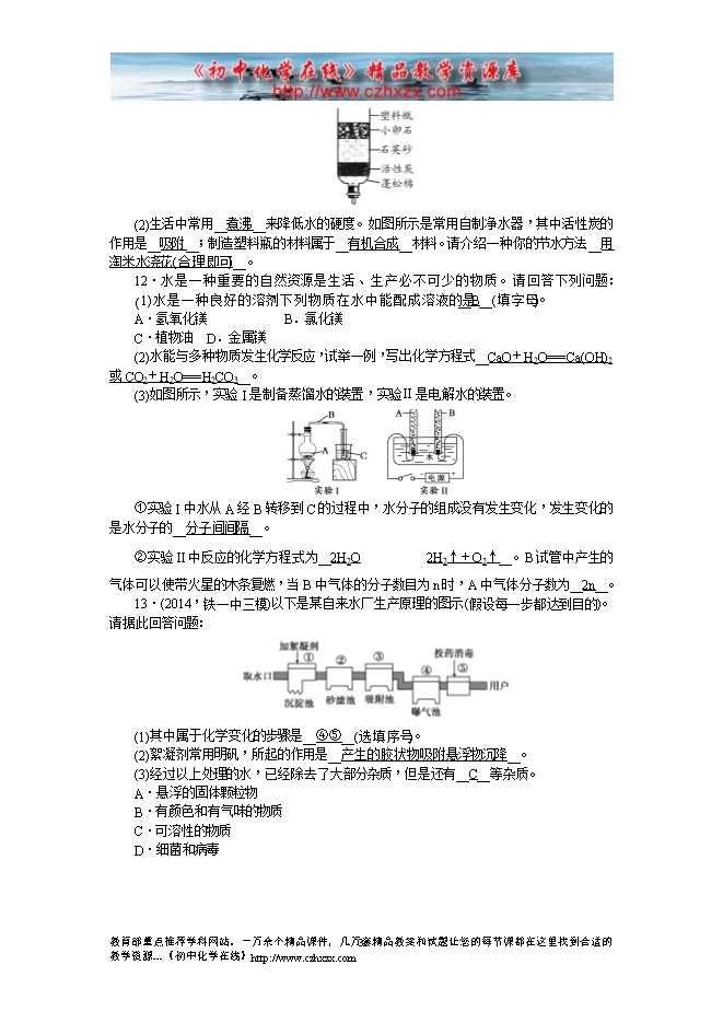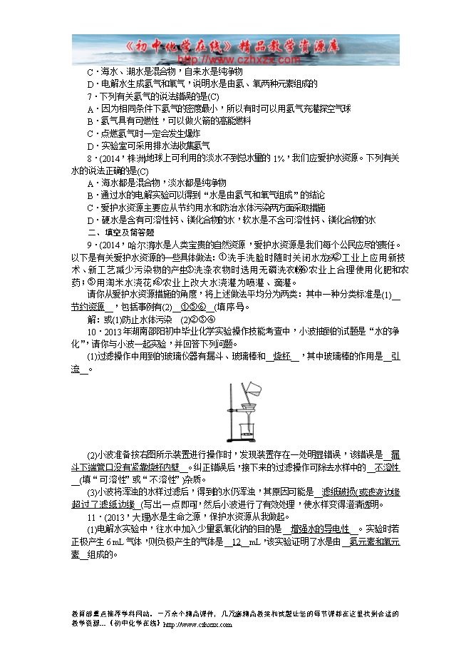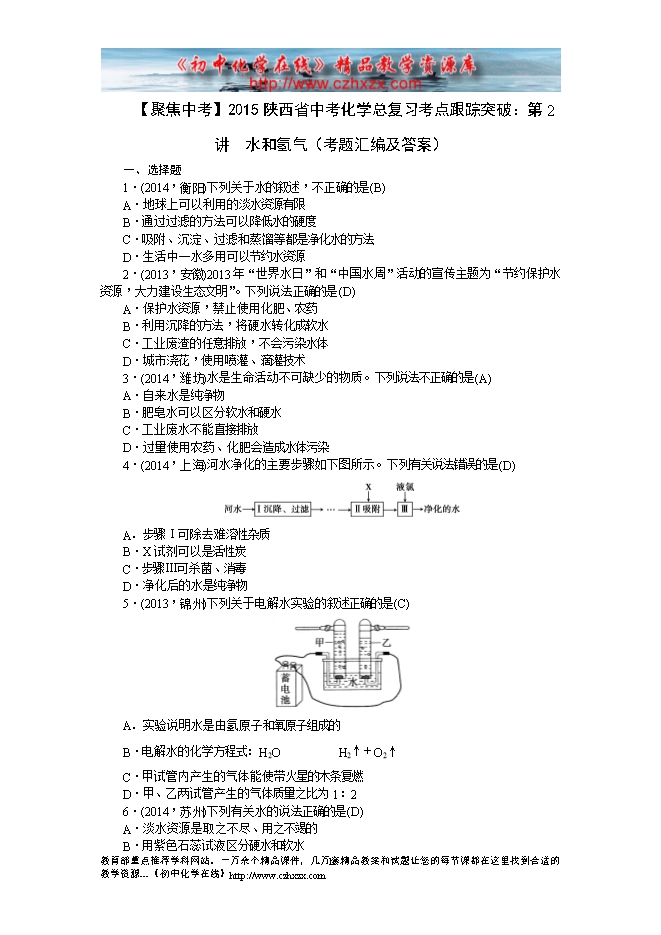 【聚焦中考】2015陕西省中考化学总复习考点跟踪突破:第2讲 水和氢气(考题汇编及答案)