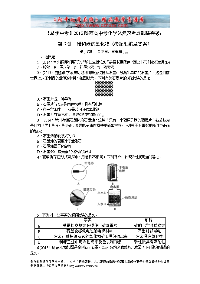 【聚焦中考】2015陕西省中考化学总复习考点跟踪突破:第3讲 碳和碳的氧化物(考题汇编及答案)